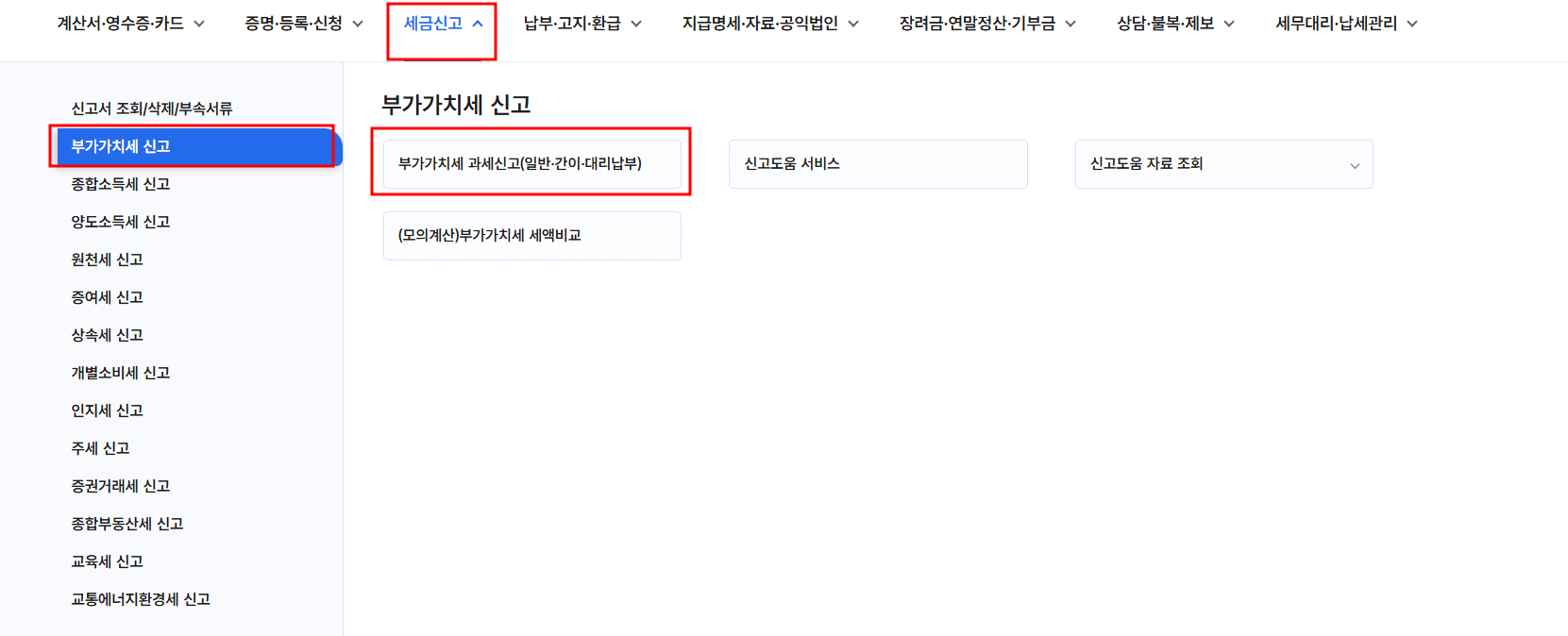 3. 메뉴에서 '세금신고' -> '부가가치세 신고' -> '부가가치세 과세신고'를 선택합니다.