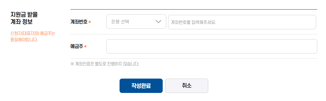 8. 지급받을 계좌 입력 후 작성완료를 클릭합니다.